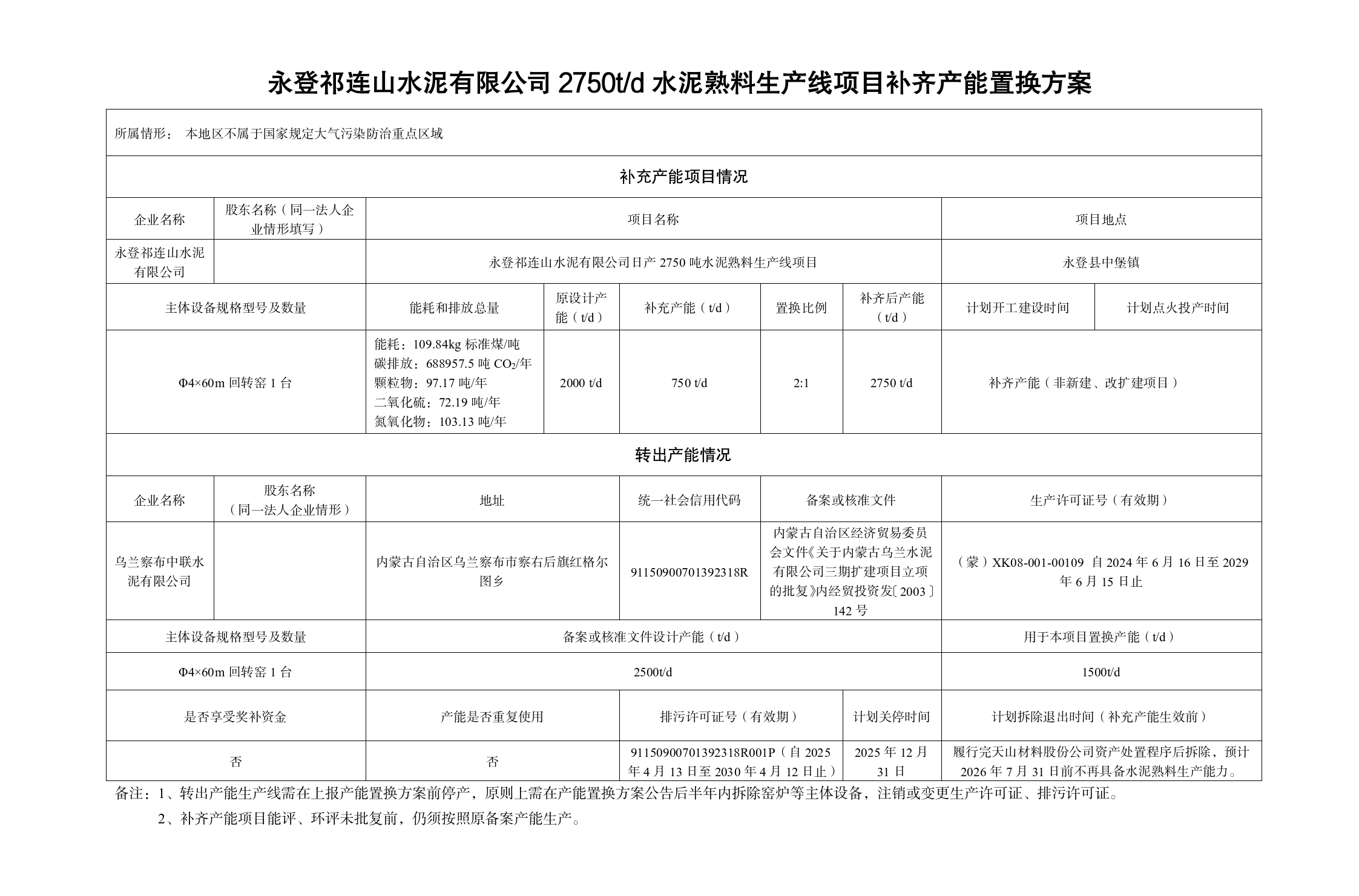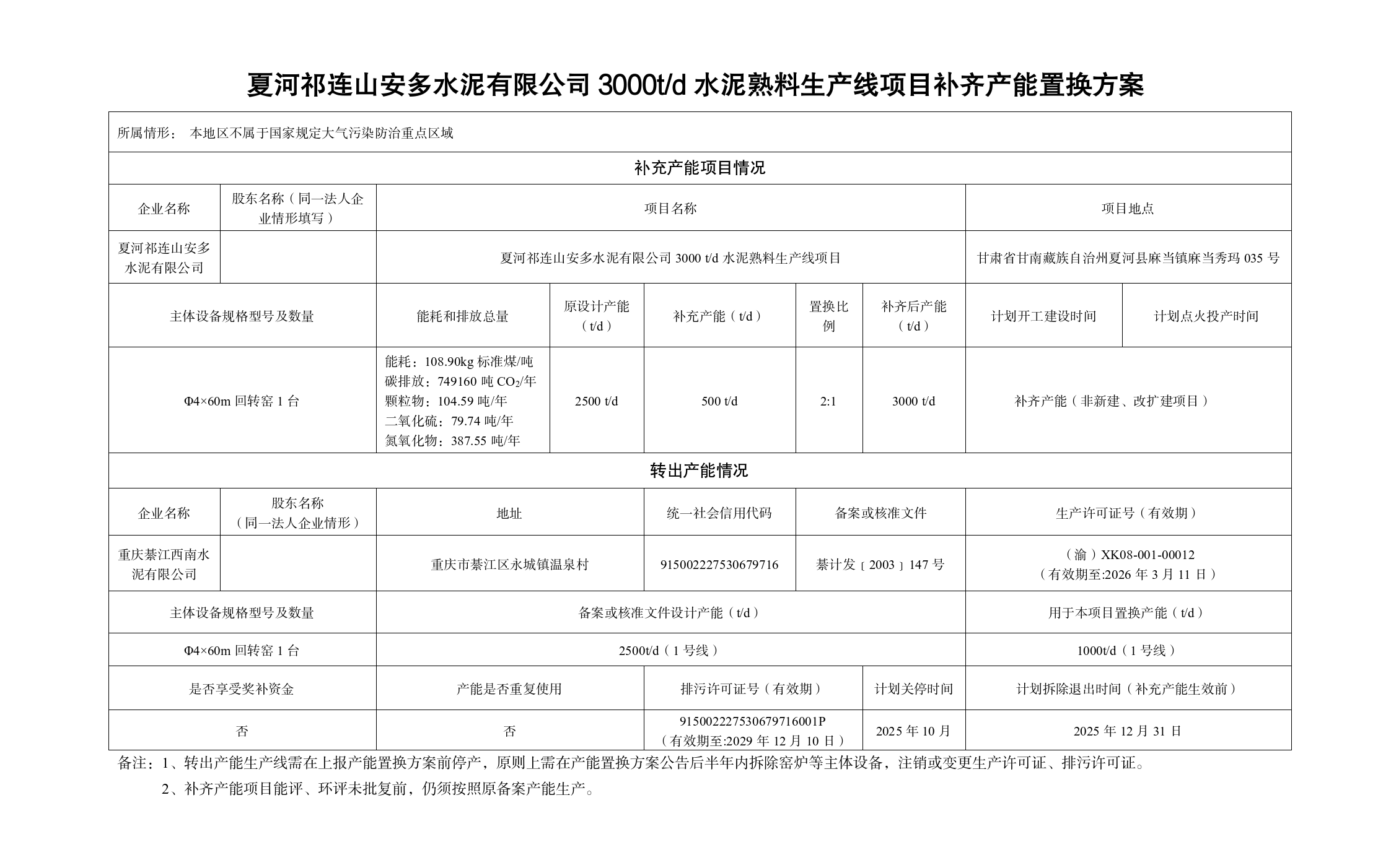 按照《国务院关于化解产能严重过剩矛盾的指导意见》(国发〔2013〕41号)、《工业和信息化部关于印发〈水泥玻璃行业产能置换实施办法(2024年本)〉的通知》(工信部原〔2024〕206号)以及工信部、国家发展改革委等四部委局办公厅有关规范水泥行业产能管理的要求,经公示无异议,现将永登祁连山水泥有限公司、古浪祁连山水泥有限公司、夏河祁连山安多水泥有限公司有关水泥熟料生产线补齐产能置换方案予以公告。